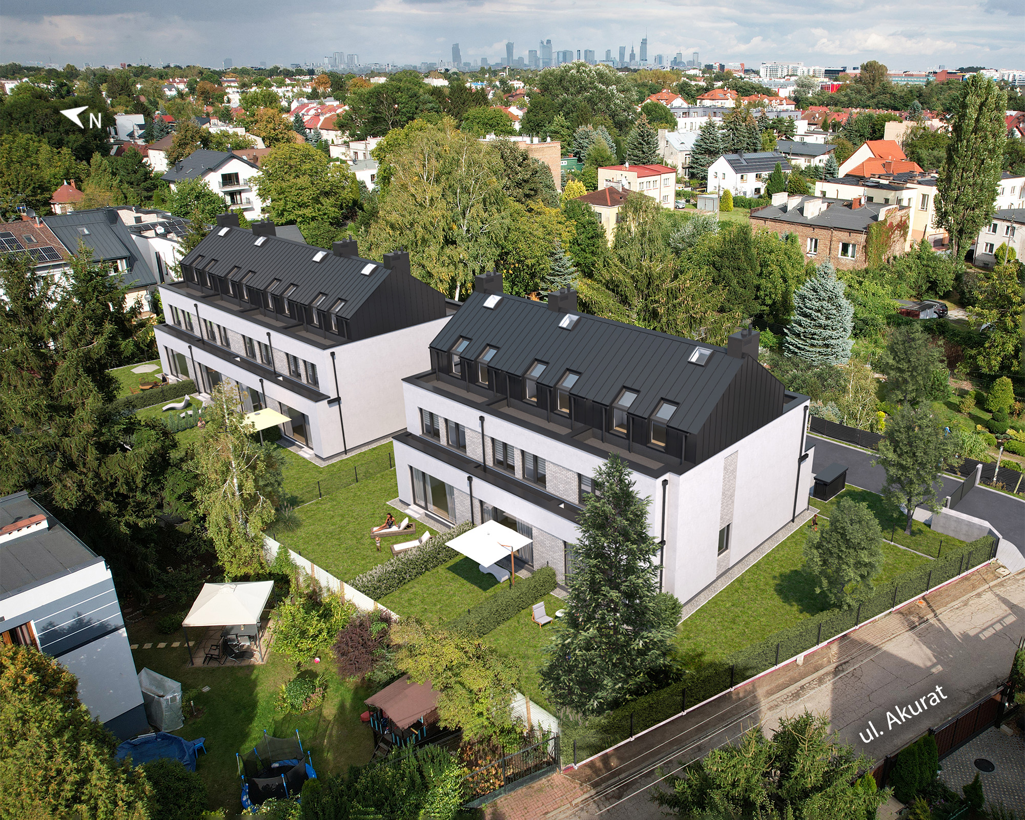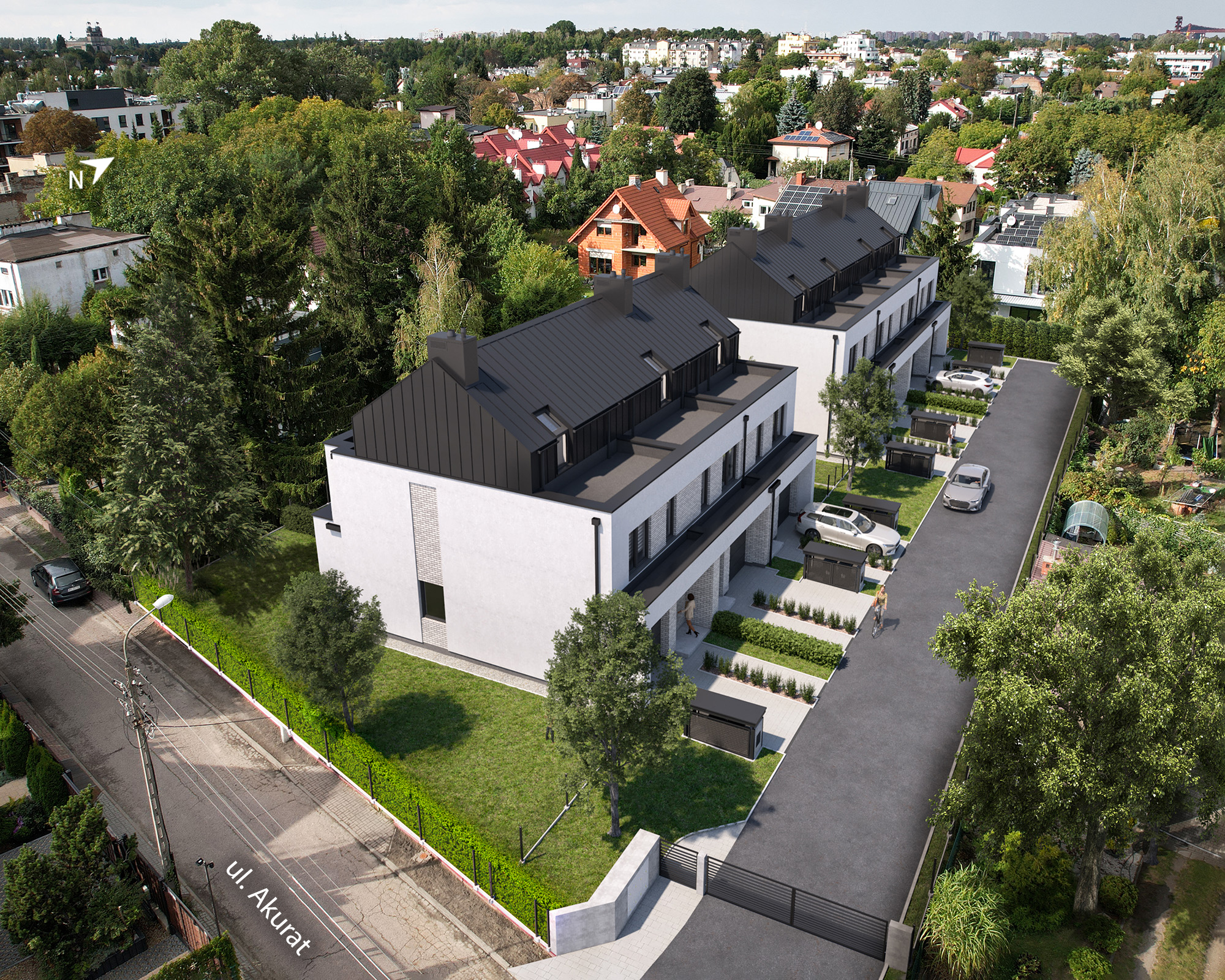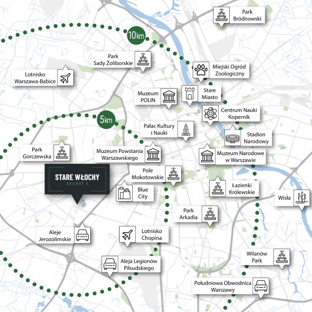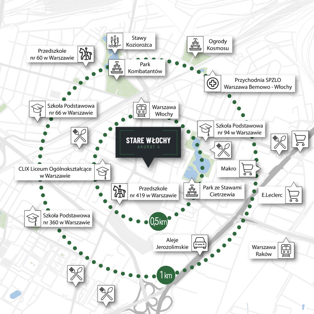 Domy zlokalizowane są przy ul. Akurat 4 w Warszawie, w niezwykle cenionej dzielnicy Stare Włochy. Jedną z jej najważniejszych zalet jest doskonałe skomunikowanie z centrum stolicy. Samochodem możesz dotrzeć do niego w ok. 15 minut, korzystając np. z pobliskich Alei Jerozolimskich.Rozwiń ∨