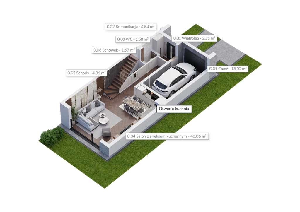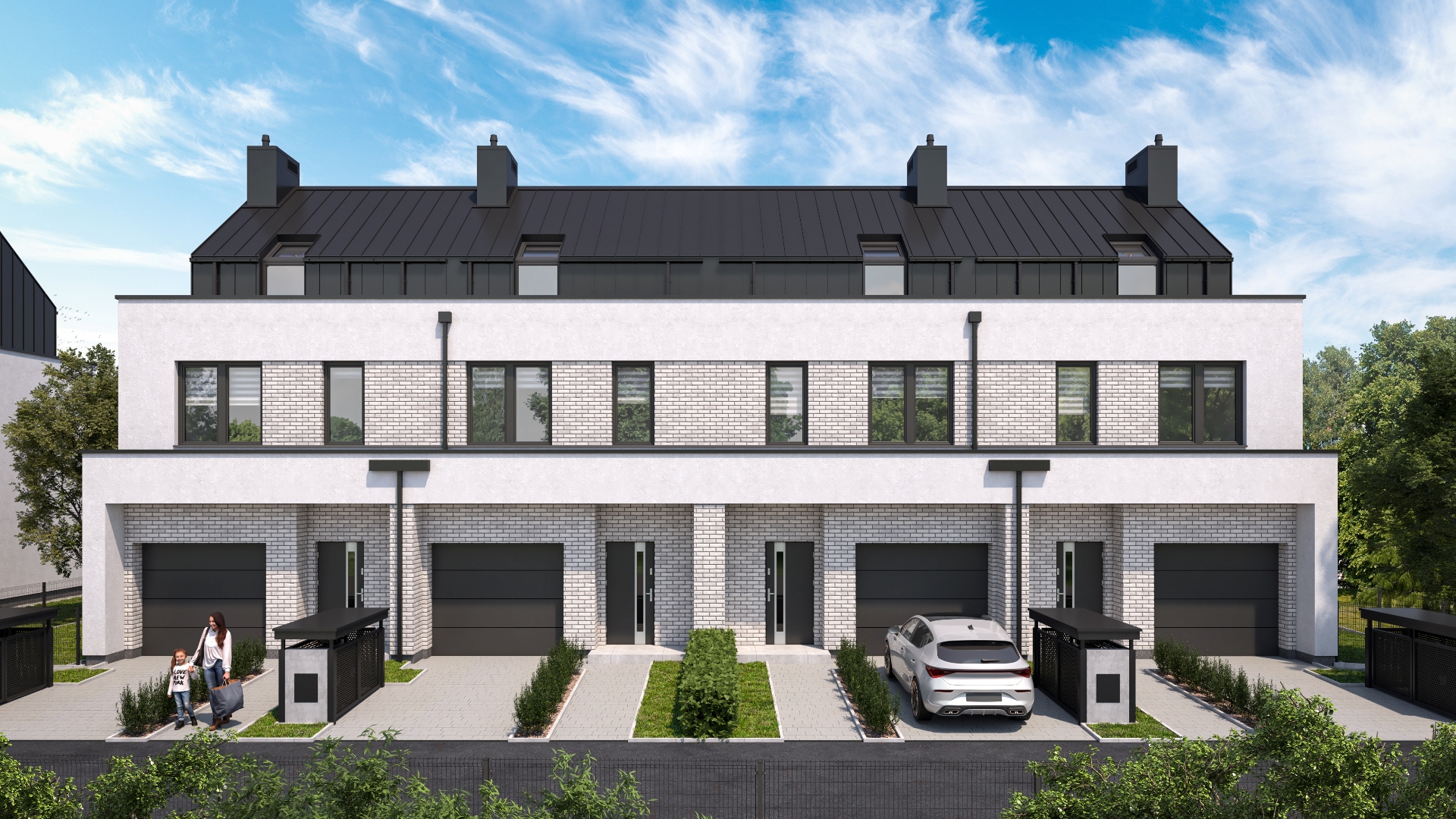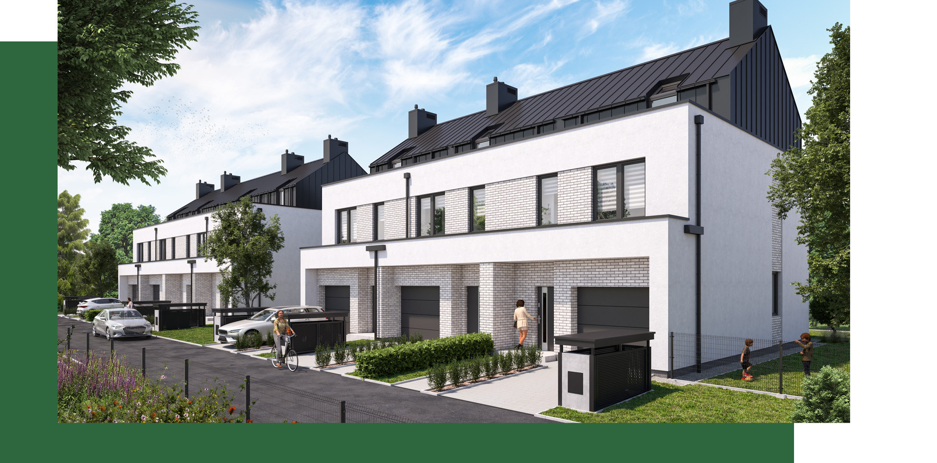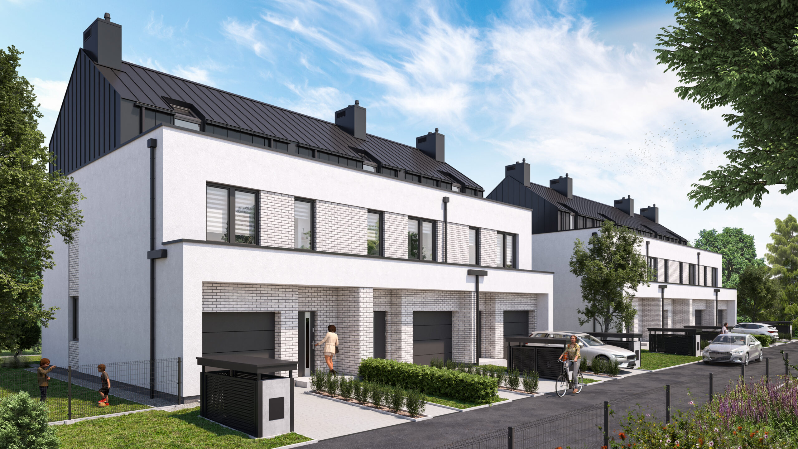 Zobacz domyNie będziesz mieć żadnych problemów z zaparkowaniem samochodu. W każdym domu, w bryle budynku na parterze, znajduje się duży jednostanowiskowy garaż – oprócz tej przestrzeni dostępne są również miejsca postojowe na podjeździe. Ponadto do każdego domu przynależy ogród, do którego wychodzi się ze słonecznego salonu przez duże okno w systemie HS.
