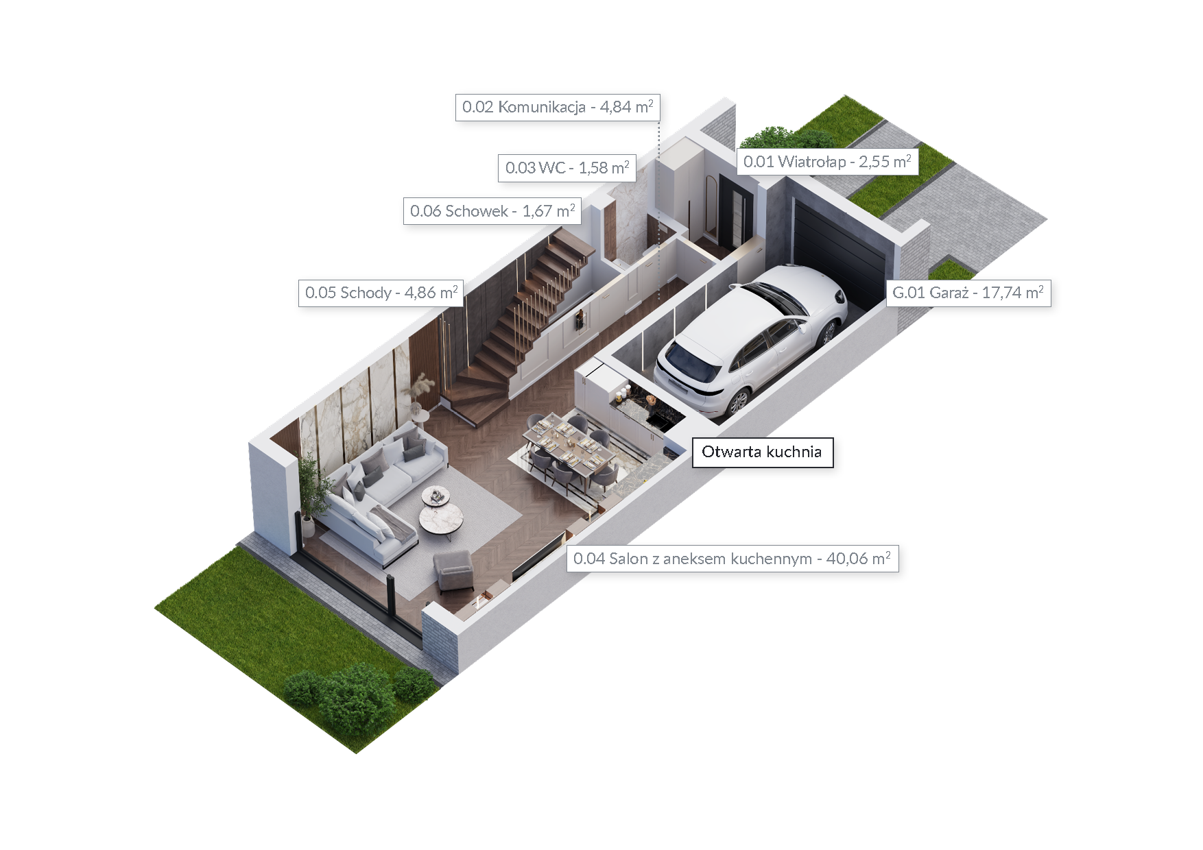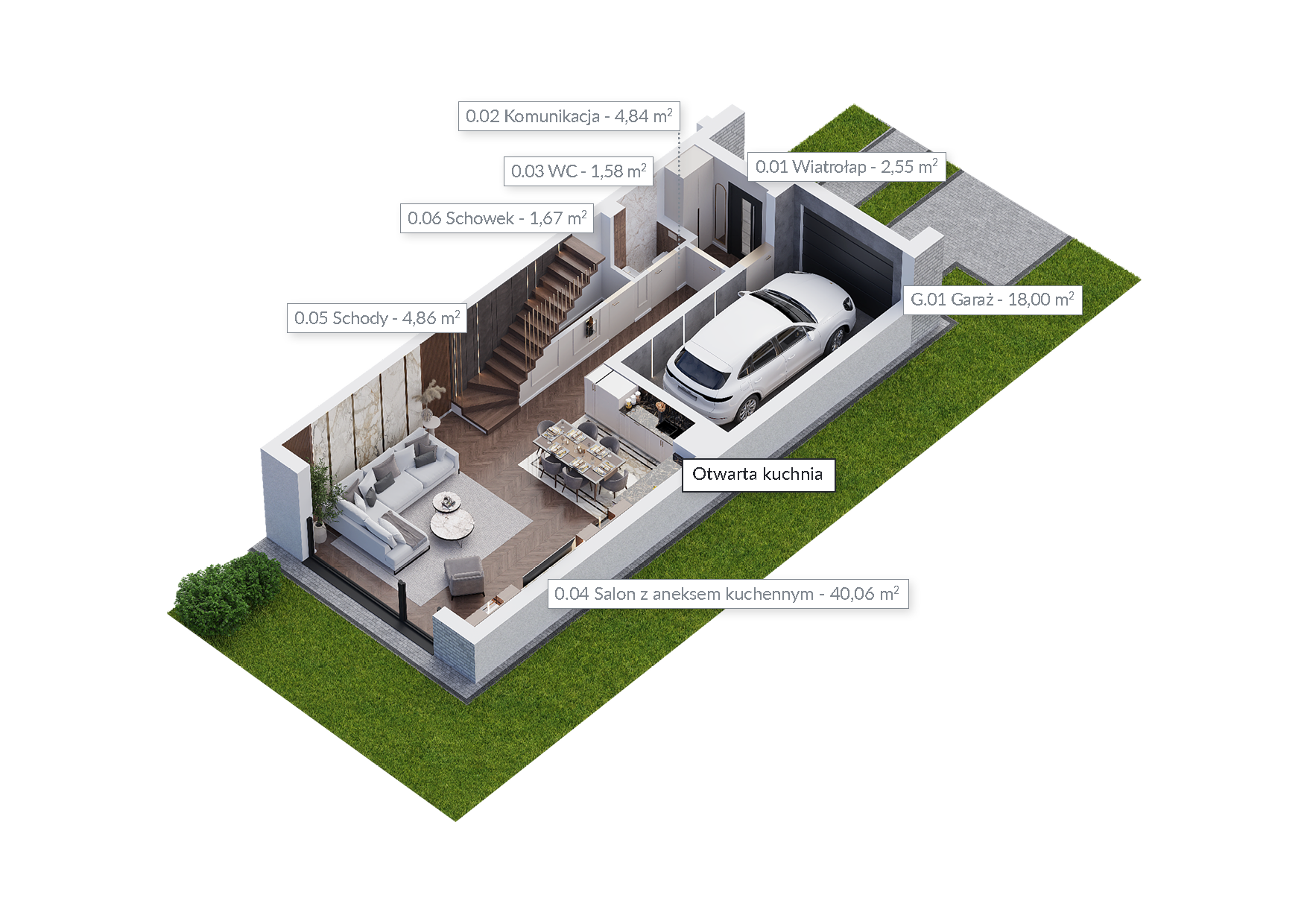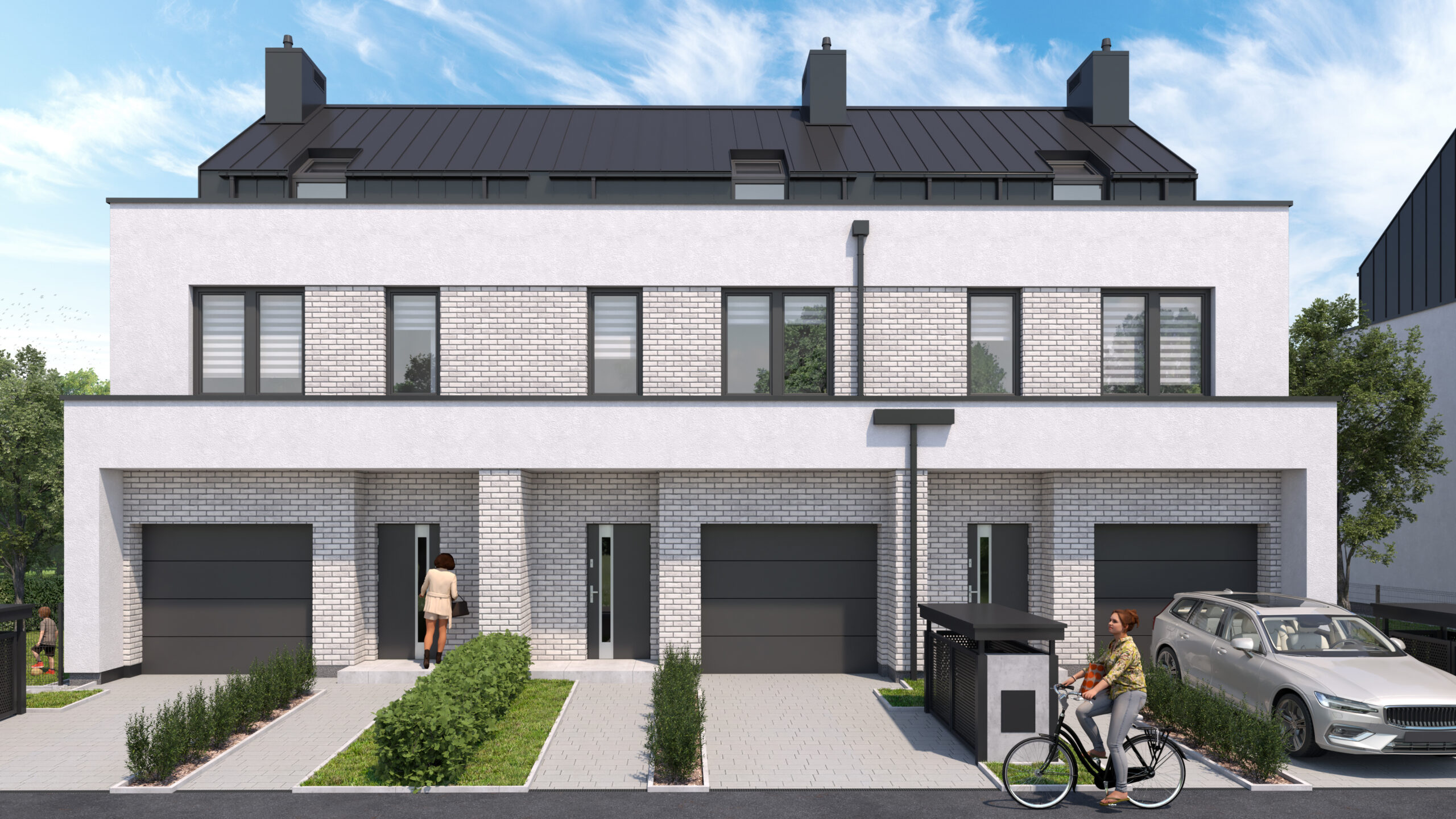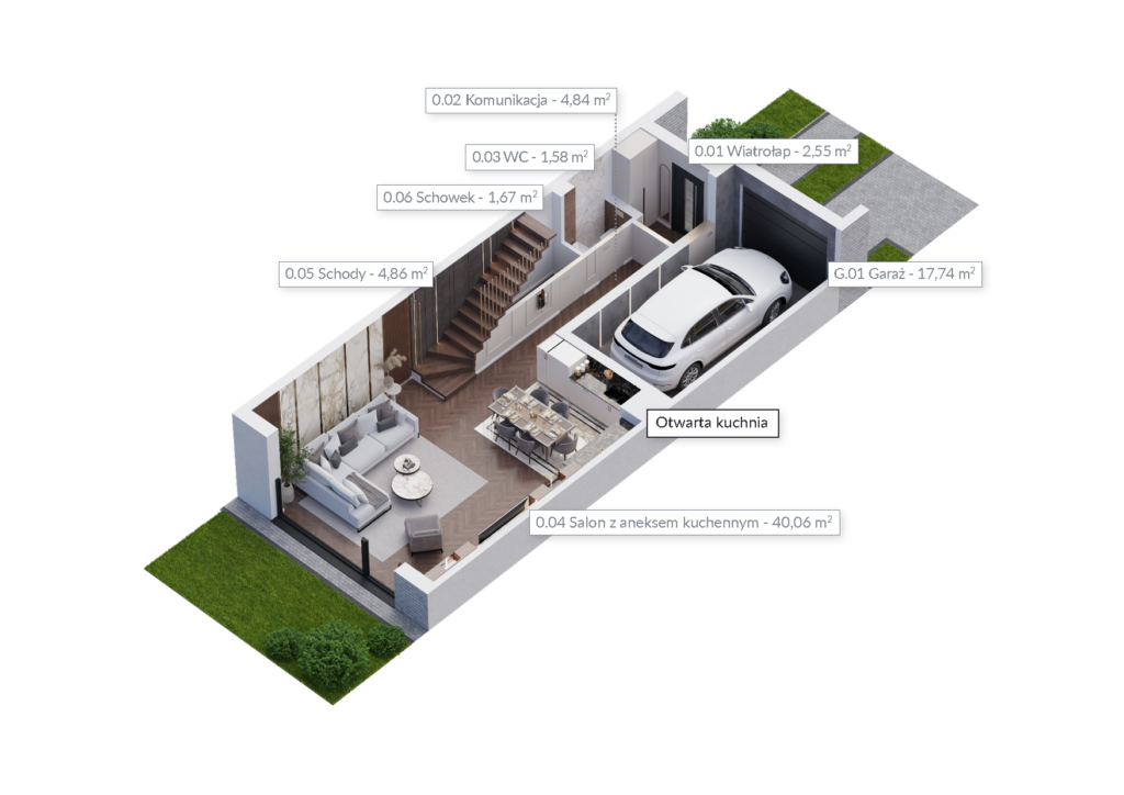 Zobacz domyNie będziesz mieć żadnych problemów z zaparkowaniem samochodu. W każdym domu, w bryle budynku na parterze, znajduje się duży jednostanowiskowy garaż – oprócz tej przestrzeni dostępne są również miejsca postojowe na podjeździe. Ponadto do każdego domu przynależy ogród, do którego wychodzi się ze słonecznego salonu przez duże okno w systemie HS.