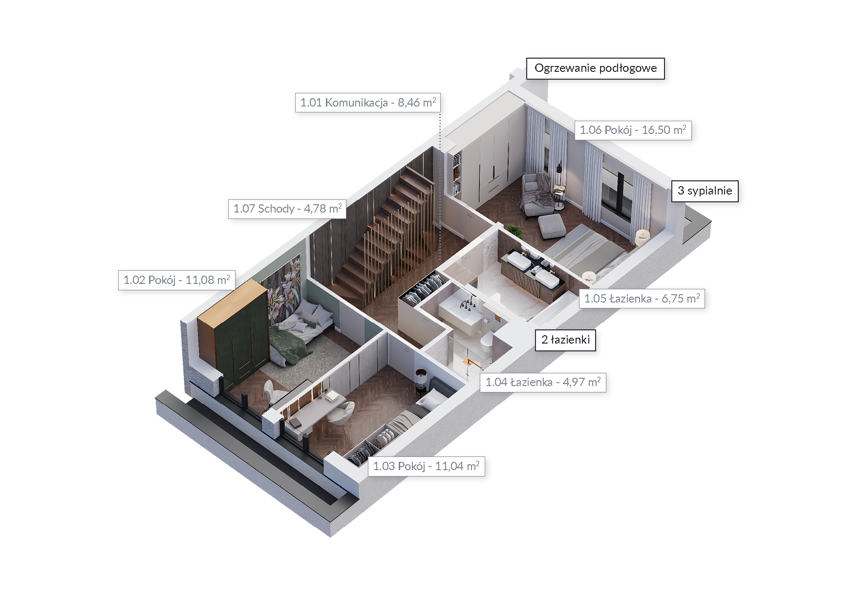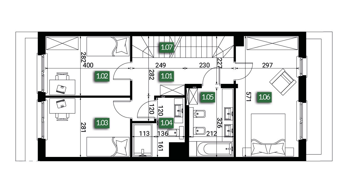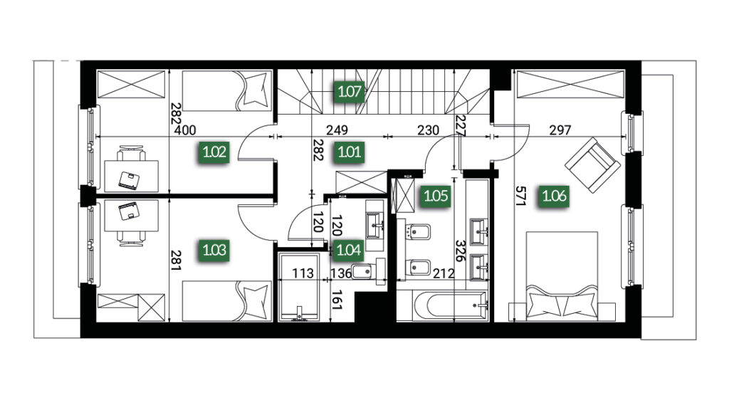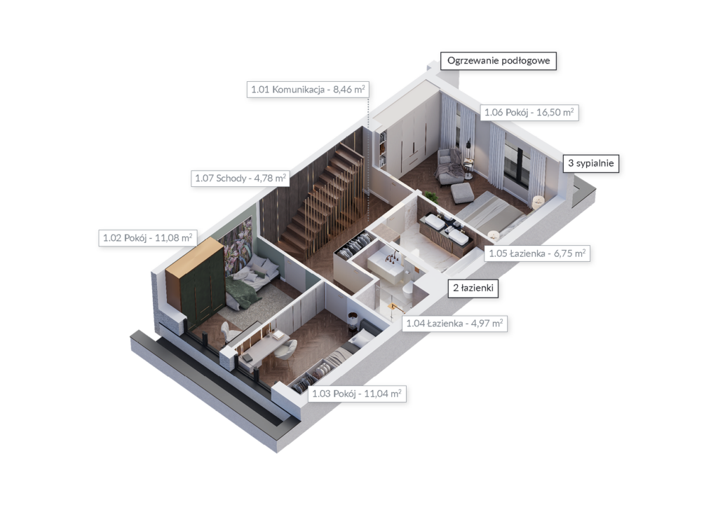 Zobacz dostępnośćDomy zostały zaprojektowane w taki sposób, by wszystkim domownikom zapewniać komfort i doskonałe warunki do odpoczynku, pracy czy nauki. Na nowoczesną przestrzeń składa się: parter z przestronnym salonem, aneksem kuchennym i WC. Pierwsze piętro to 3 duże pokoje i 2 łazienki. Na drugim piętrze znajduje się kolejny pokój, łazienka oraz pomieszczenie techniczne. Obecny etap inwestycji pozwala nam dostosować układ wnętrz do Twoich indywidualnych potrzeb.