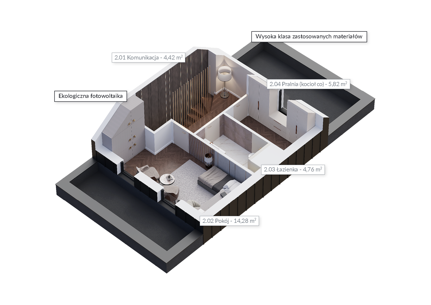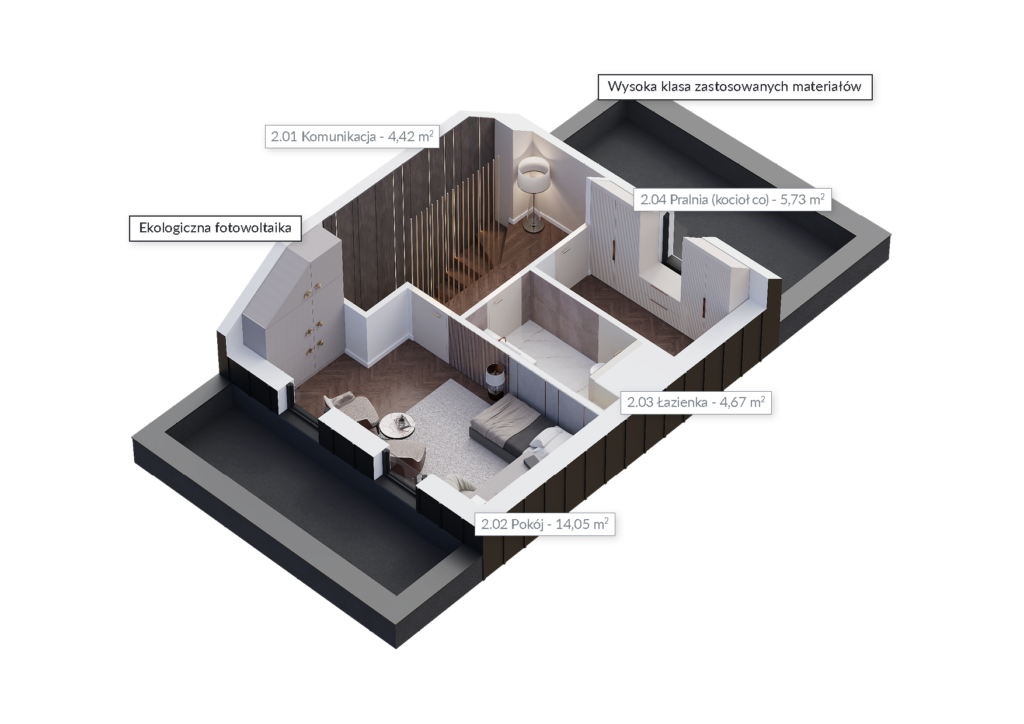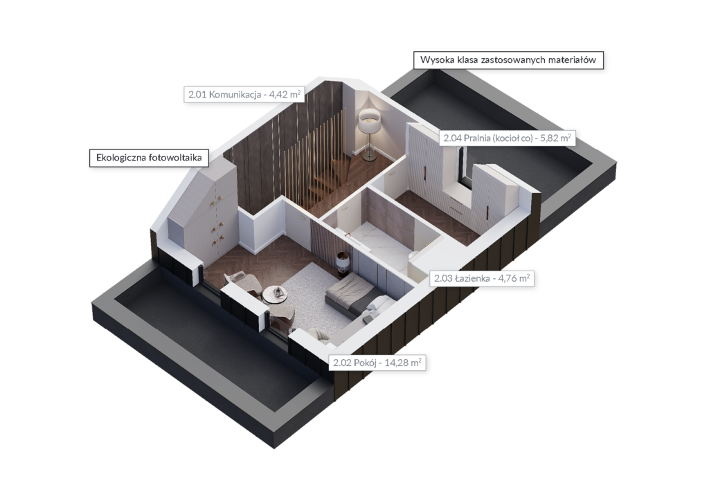 Estetyczna bryła i wykończenie budynków to nie wszystko. W standardzie każdego domu masz do dyspozycji fotowoltaikę oraz ogrzewanie podłogowe. Jako opcję możesz wybrać m.in.: klimatyzację, system smart home, stację ładowania samochodu elektrycznego, system automatycznego nawodnienia ogrodu, okna o podwyższonych parametrach P2A, instalację alarmową, kamery oraz antywłamaniowe rolety zewnętrzne.